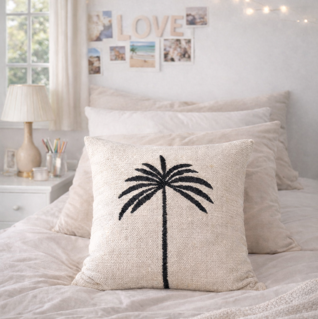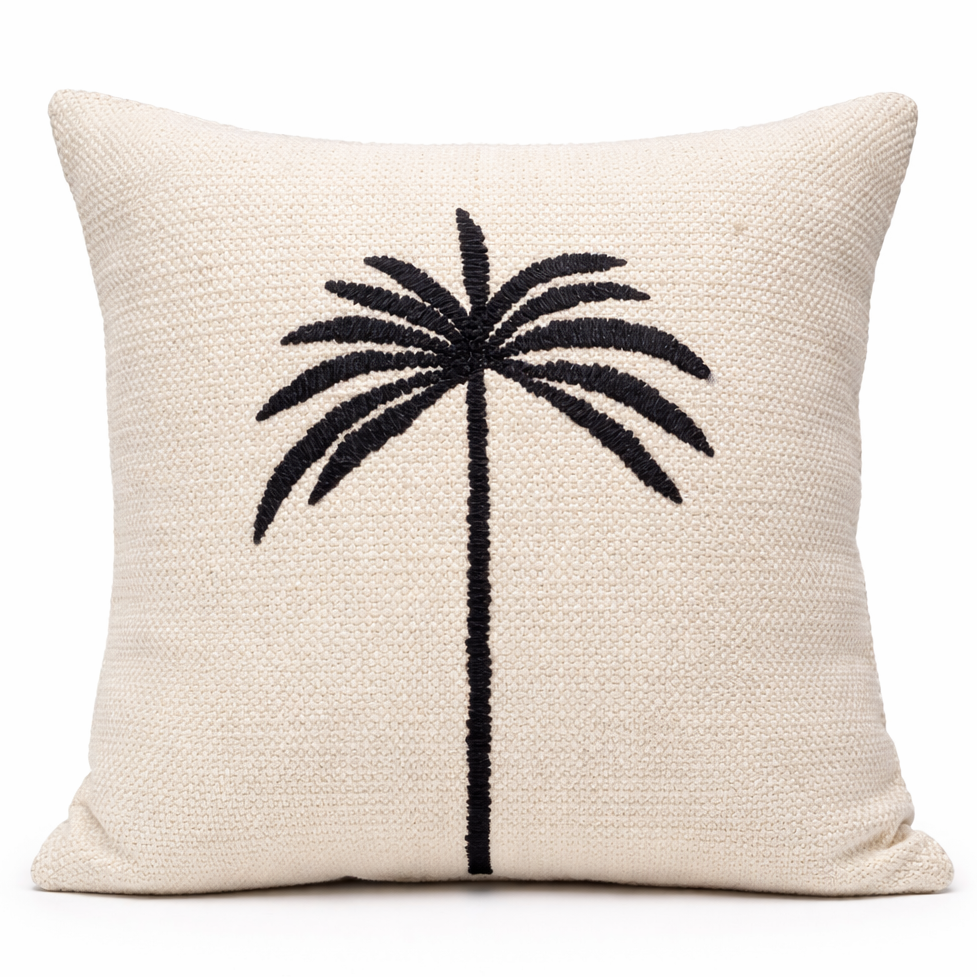 כרית נוי אלגנטית בעיצוב טבעי ונקי, עשויה 100% כותנה איכותית עם רקמה עדינה של דקל מנימליסטי.